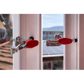 Die 8 mm starke Platte wird exakt nach Ihren Fenstermassen gefertigt und verfügt über eine Öffnung für den Abluftschlauch. Sie wird einfach ins geöffnete Fenster eingesetzt und mit Kniehebelspannern befestigt – ganz ohne Bohren oder Beschädigung des Fensterrahmens. Stabil, wetterfest und in Sekunden montiert..